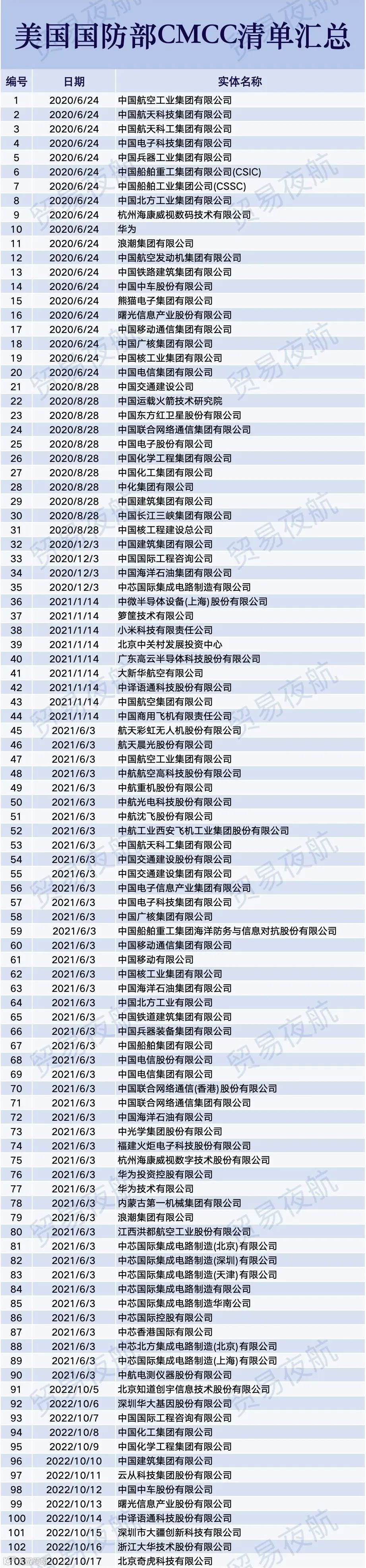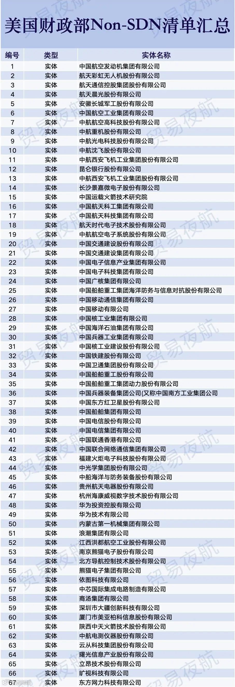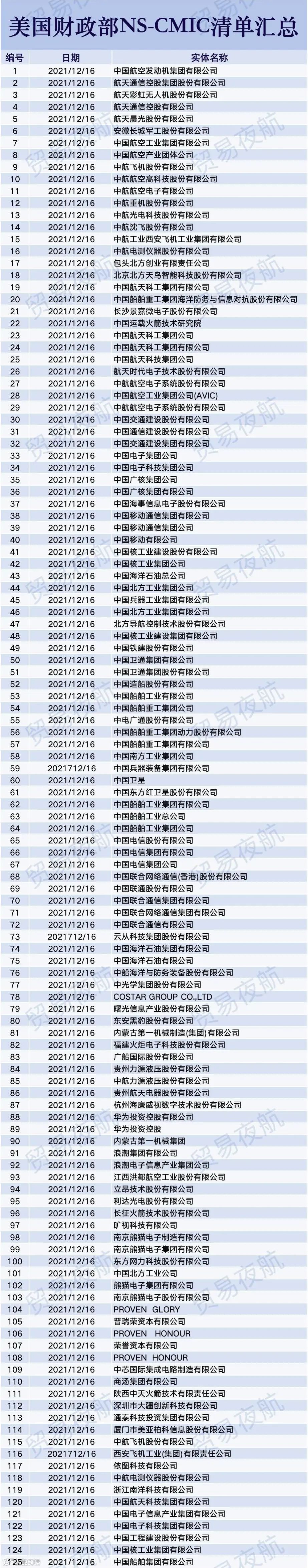 即“中国军事企业制裁清单”,由美国国防部制定,针对被认为与军方有关联的企业。制裁措施包括禁止美国个人和实体投资或交易[k]。