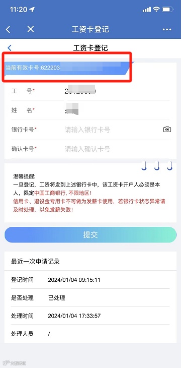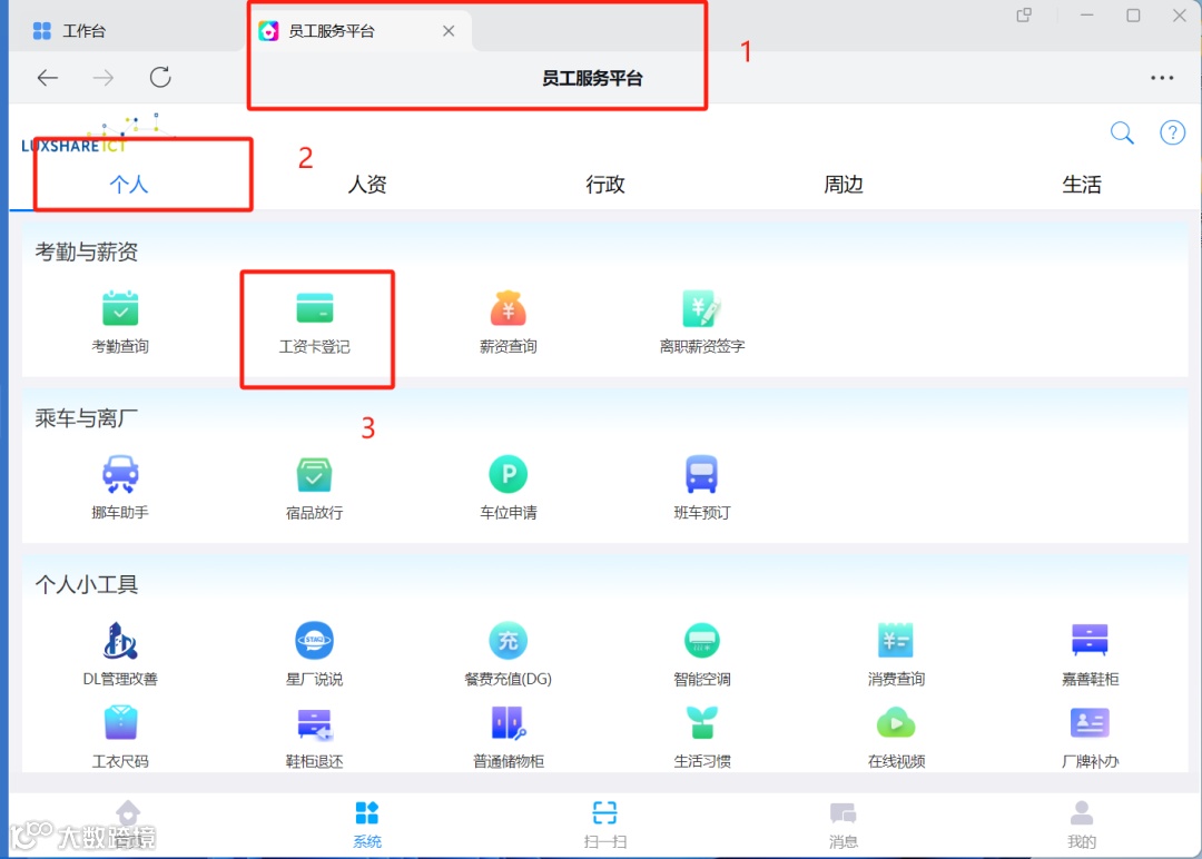 3、登记及更换银行卡路径:员工服务平台-个人-工资卡登记;