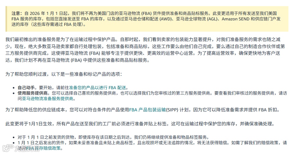 7月29日,亚马逊突然发布一则重磅公告:自2026年1月1日起,美国站将停止FBA备货和商品贴标服务。这项新政面向所有发货至FBA的库存,以及通过亚马逊仓储(AWD)、亚马逊全球物流(AGL)、亚马逊跨境承运伙伴方案(SEND)等渠道入库的货物。