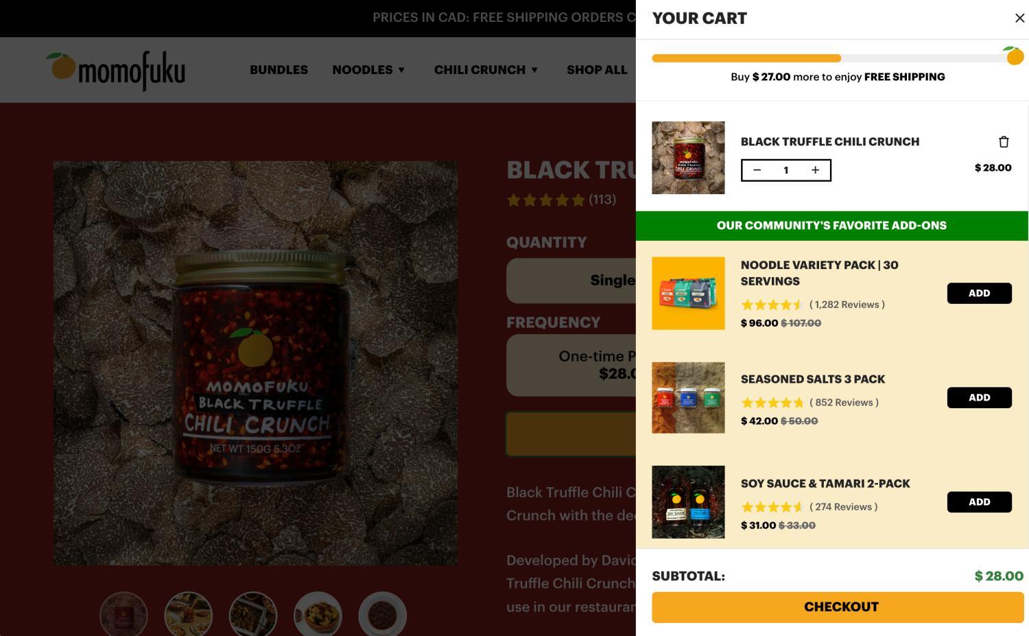 55%的购物者因为额外费用过高而放弃了在线购物车。购物者希望,他们在产品页面上看到的价格就是从他们的银行账户中扣除的确切金额。Momofuku在客户点击结账前提醒他们,增加订单金额即可免运费。