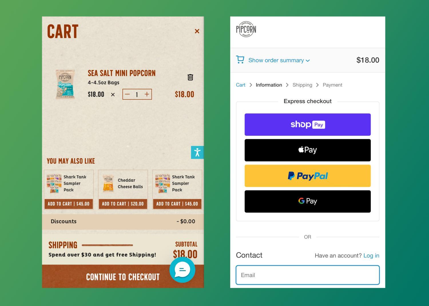Pipcorn使用Shopify Checkout(Shopify的结账页面)提供了友好的移动端体验。结账页面会自动调整为小屏幕,结账按钮和字体很醒目,方便购物者点击,这样可以促使消费者在智能手机上完成购买。