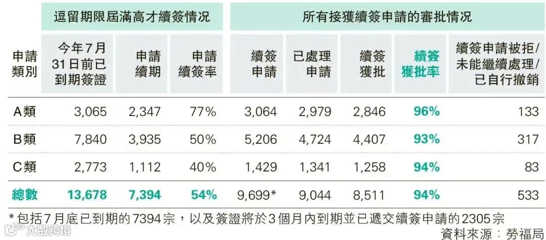 在入境处已处理的9,044宗续签申请中,有8,511宗成功获批,整体续签获批率高达94%,如果以首批到期签证的总人数为基数计算,最终成功留港的比例约为50%。