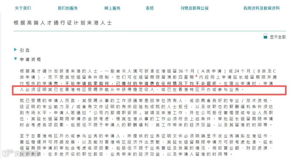 ③为非香港公司工作但主要业务在香港:适用于受雇于海外公司但被派往香港工作的人士,需证明您的职责需要在香港履行,年薪通常需达到120万港元以上,并提供香港的纳税记录。