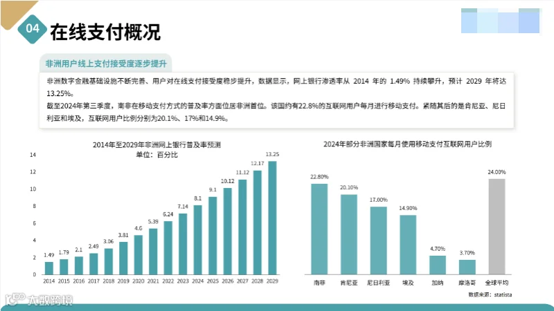 2024 年非洲互联网普及率达 44.19%,用户规模 5.816 亿,预计 2029 年将增至 8.747 亿;移动支付渗透率稳步提升,南非、肯尼亚等国月均移动支付用户占比超 20%,为线上交易提供支撑。 - 电商生态逐步成熟