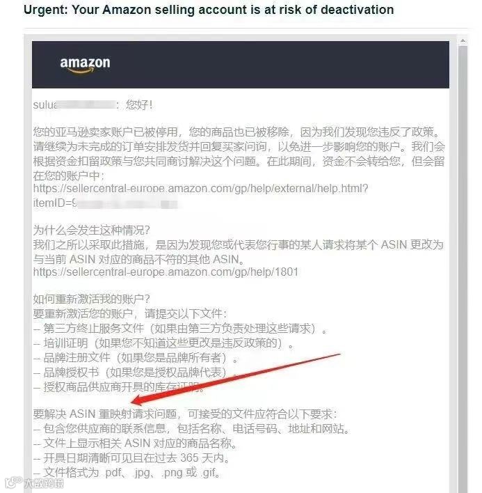 根据这位卖家提供了邮件来看,亚马逊发现卖家或代表其行事的某人,请求将某个ASIN更改为与当前ASIN对应的商品不符的其他ASIN。同时亚马逊将卖家账户停用,商品也被移除。