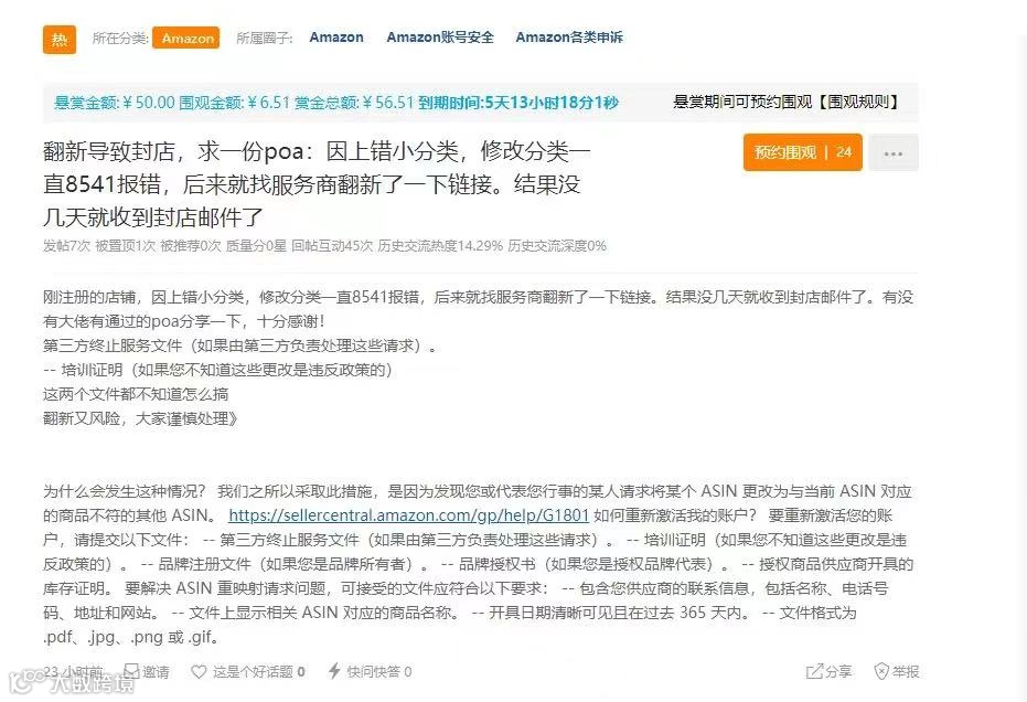 最近有卖家发帖求助称自己因为上错小分类,修改分类一直8541报错,后来就找服务商翻新了一下链接,结果没几天就收到封店邮件了。