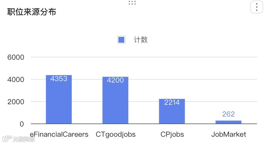 其中有4353个职位来源于eFinancialCareers,4200个职位来源于CTgoodjobs。此外还有CPjobs,职位来源占比大概20%。