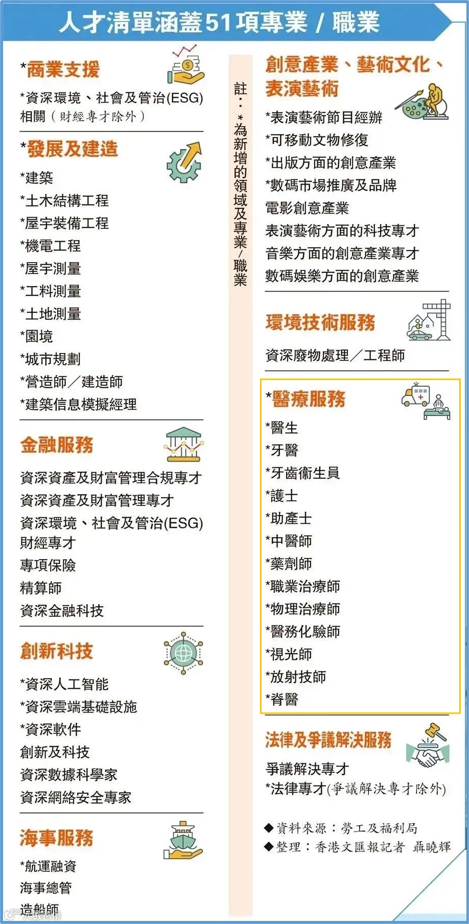 也从去年开始扩增人才清单,从13项人才新增至51项人才,其中新加入“医疗服务”领域,又细分为13个医生类别:医生、牙医、牙齿卫生员、护士、助产士、中医师、药剂师、职业治疗师、物理治疗师、医务化验师、视光师、放射技师、脊医。