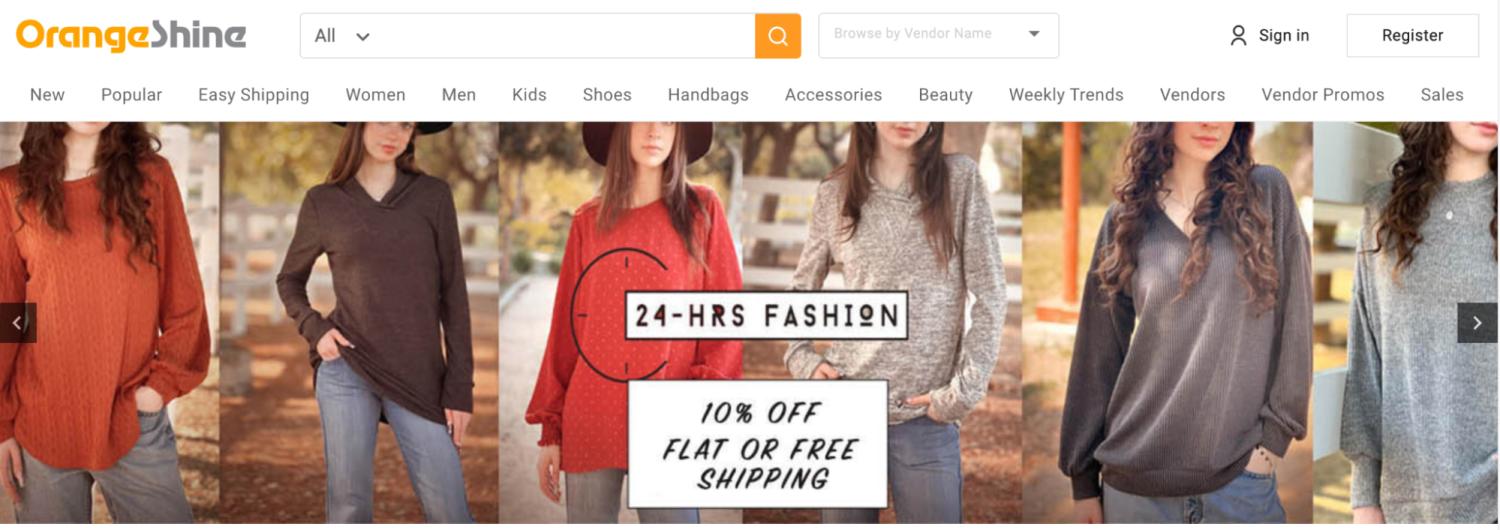OrangeShine的主页以女性服装为主,但该批发商也有男装和童装,此外还有鞋类、配饰、手袋和美容产品。虽然总部位于洛杉矶,但它向全球发货。
