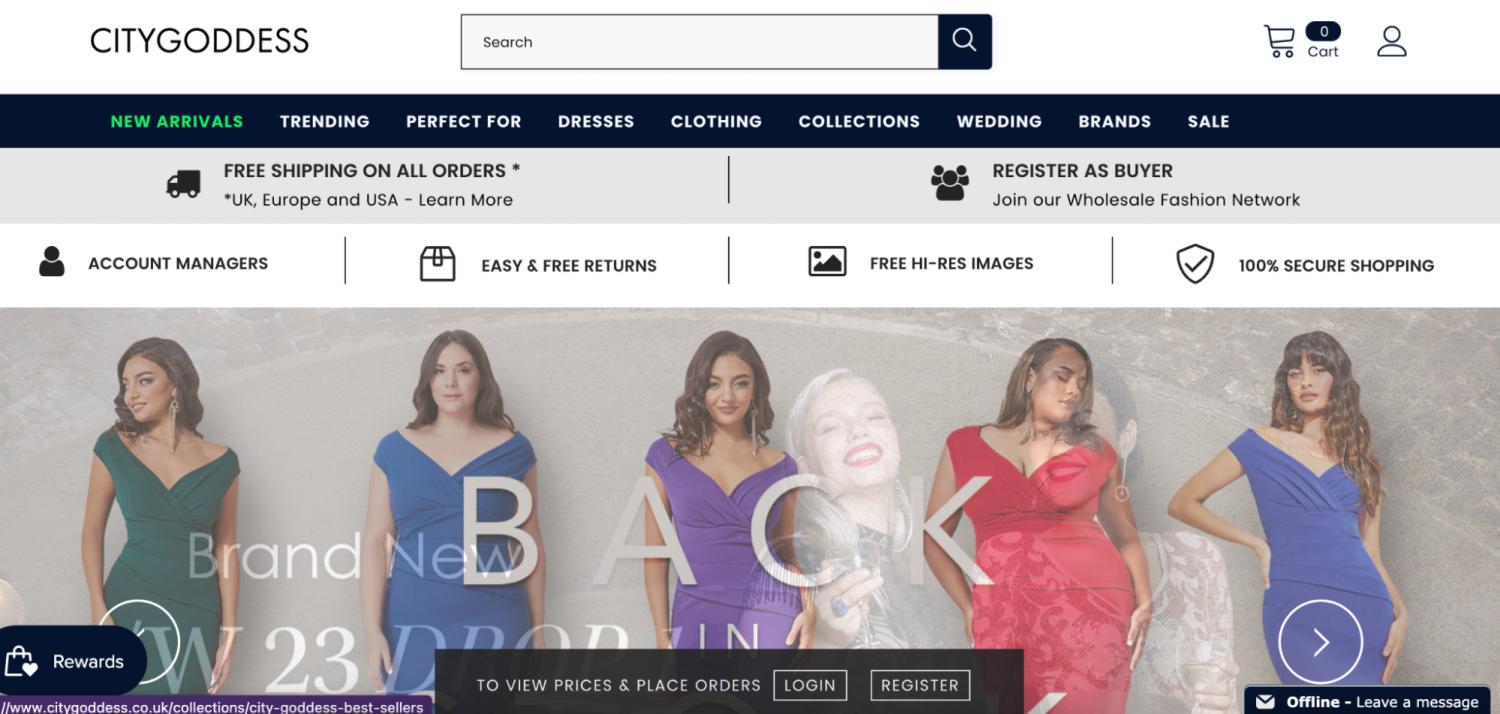 City Goddess是高端、流行女装、鞋类和配饰的最佳批发商之一。在这里,你可以找到大量连衣裙、休闲服装和正式服装。你可以按件购买服装,批发同款服装,或混合购买不同款服装,以试用其产品和风格。最低订单金额为150英镑(约1350元人民币),City Goddess提供国际配送服务。