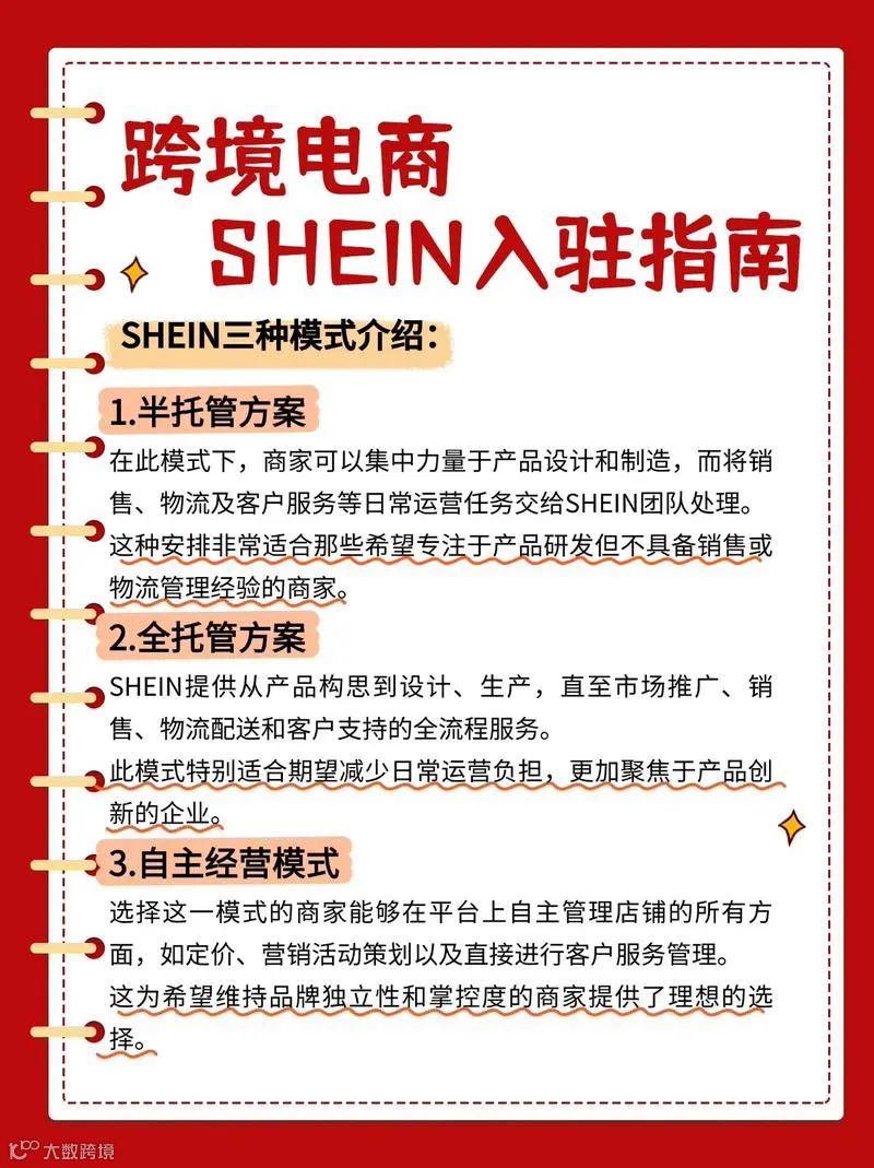 目前,SHEIN平台已推出自营、全托管和半托管三种运营模式,其中半托管模式已正式对外开放招商,为跨境卖家提供新的业务拓展路径[k]。