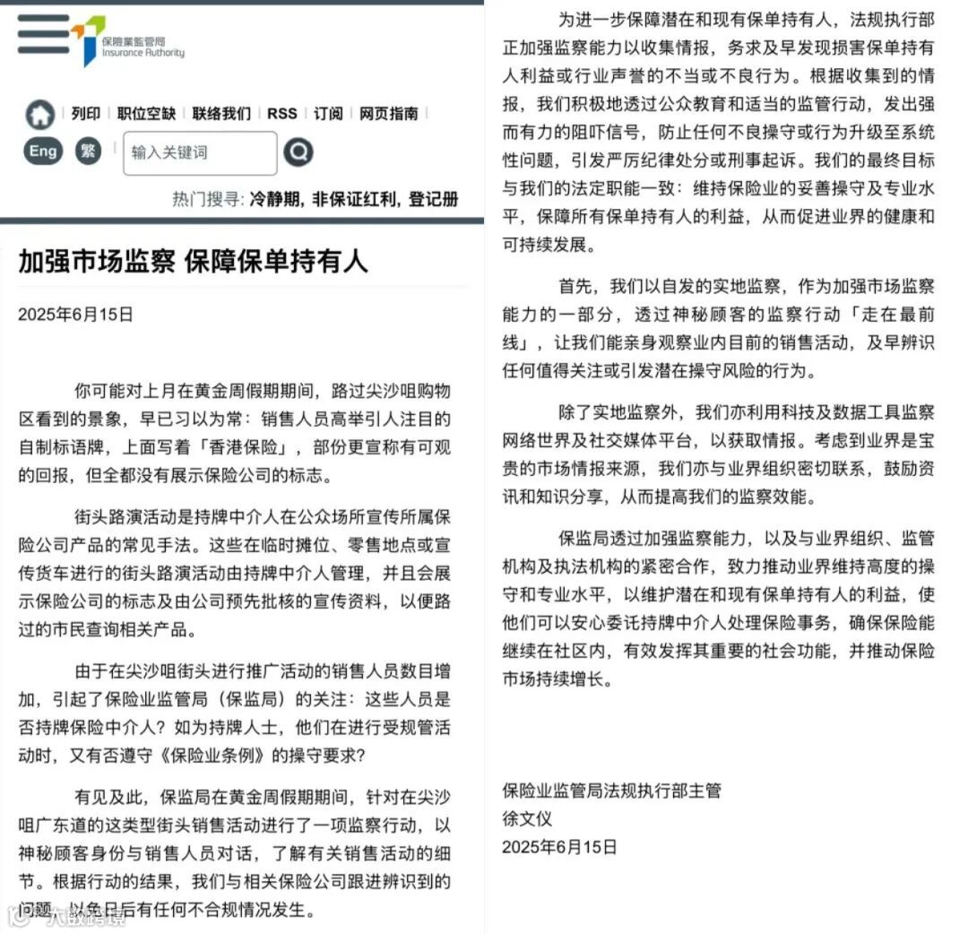 其实早在今年6月15日,香港保监局就已发布了一篇题为《加强市场监察 保障保单持有人》的文章,明确将监察重点指向了海港城楼下常见的举牌推销保险行为。