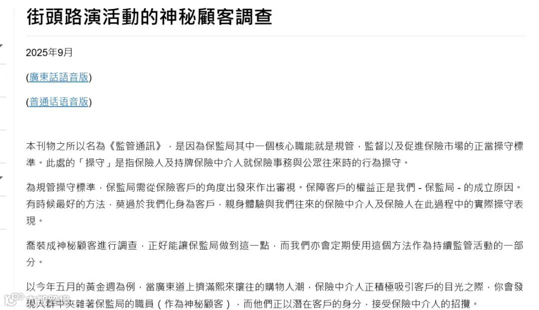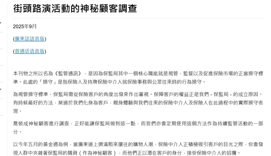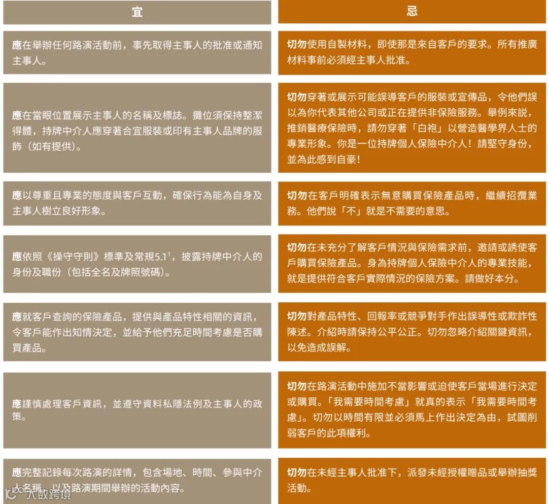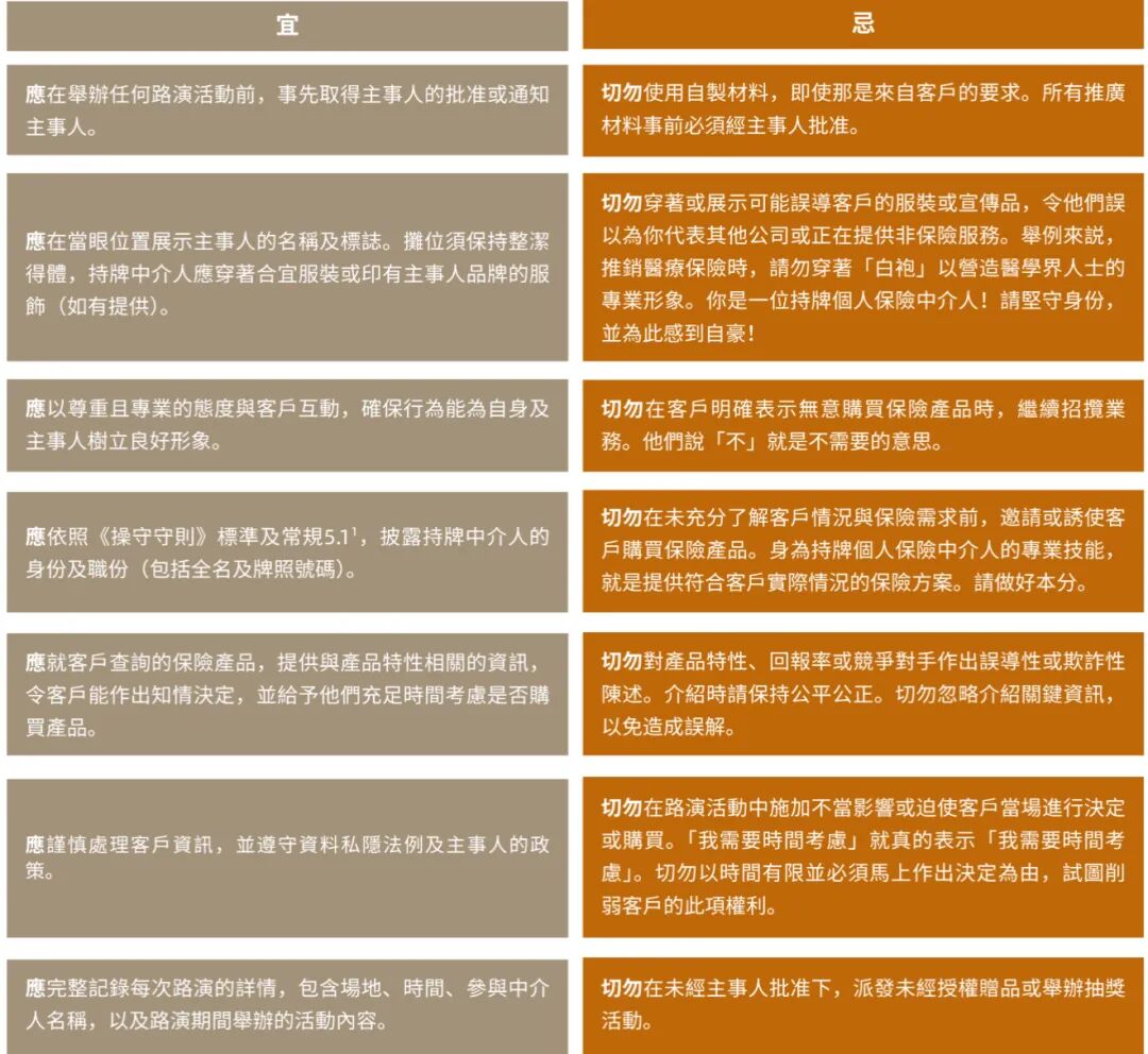 9月份,保监局再次发出监管通讯,详细公布了针对街头路演活动的神秘顾客调查结果。报告中明确指出了多项不合规行为,例如对预期收益中保证与非保证部分未作清晰说明等。同时,监管方还同步发布了持牌中介人的操守行为清单,详细列举了允许和禁止的展业规范。