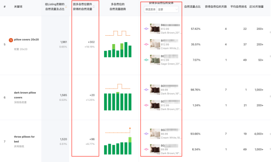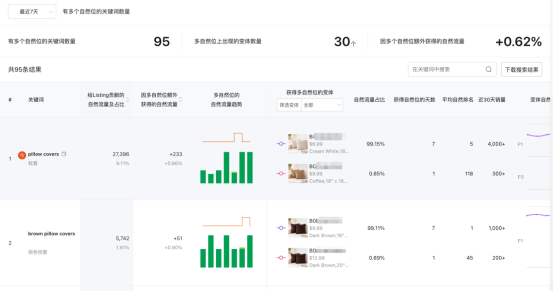 更实用的是后面的数据:向右拉动页面底端的进度条,会清晰显示关键词给listing贡献的自然流量及占比、因多自然位额外获得的自然流量、获得多自然位的变体等多项数据。这些数据非常关键,它们不只是告诉你“发生了”,还能让你精准知道“发生在哪里、影响到什么程度”。