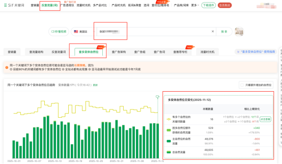 我是在Sif官网的反查流量词页面核实的,操作很简单:输入ASIN后选择“查多变体自然位”,往下拉就能看到关键信息,平台还会用明确标签标注了几种情况: