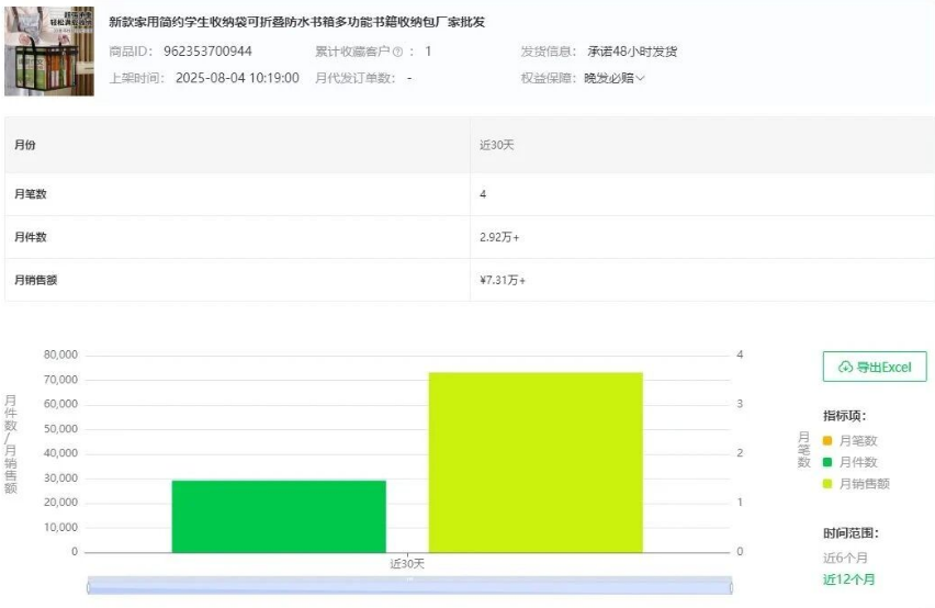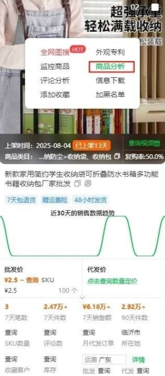 就用学生收纳袋为例,进行商品分析:从数据看到,这款学生收纳袋2025年8月上架,已经达到了2.92万+的销售件数,这可能和开学季有关系。