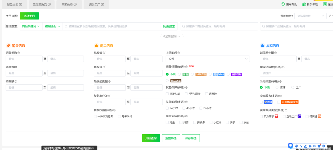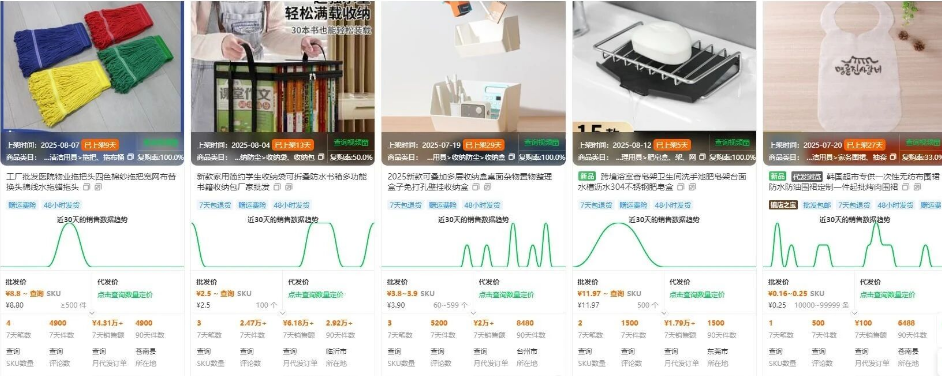 筛选后,优质货源自动呈现:高复购率+完善售后+工厂直发的好产品。每个商品卡片清晰展示:产地、SKU数、销售数据趋势等。关键数据直接外露,选品决策快人一步!🚀