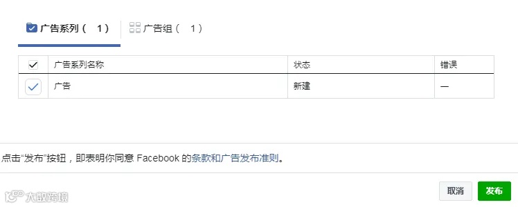 7.勾选需要投放的广告点击就右上角的检查并发布,确认信息后点发布,等待FB审核通过后即可展示广告
