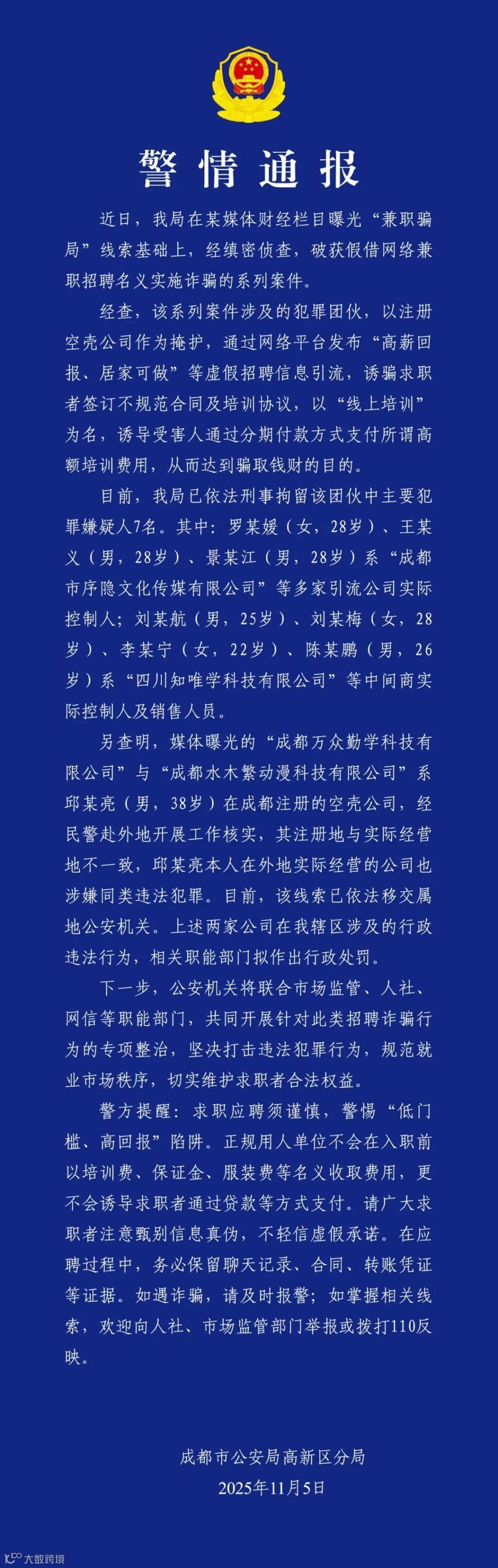 另查明,媒体曝光的“成都万众勤学科技有限公司”与“成都水木繁动漫科技有限公司”系邱某亮(男,38岁)在成都注册的空壳公司,经民警赴外地开展工作核实,其注册地与实际经营地不一致,邱某亮本人在外地实际经营的公司也涉嫌同类违法犯罪。目前,该线索已依法移交属地公安机关。上述两家公司在我辖区涉及的行政违法行为,相关职能部门拟作出行政处罚。