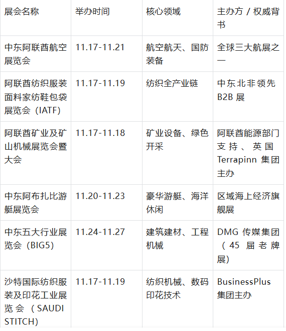 沙特与阿联酋的展会热潮,本质是资源国向 “制造 + 消费” 双驱动转型的缩影 —— 这里既有千亿美元的基建订单、年轻化的消费市场,也有贸易政策调整的挑战。11 月的 6 场展会,既是中企展示技术实力的舞台,更是理解中东市场规则的课堂。