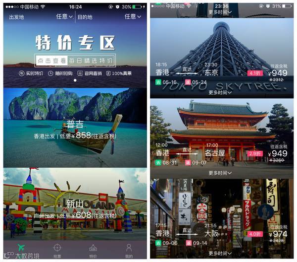 航空大促的时候,网站各种挤不进去,各种拼网速,手速和人品,等好不容易挤进去特价机票就没了(心里一万个草泥马在狂奔)。只要选择目的地填写机票预算价格会有相对应的成功率参考,软件会自动在所有航空公司去模糊匹配,一旦匹配到你的预算价格就会马上帮你出票,出了自动抢票功能,还有一个实时特价专区,里面显示的都是目前航空公司价格最便宜的航线,马上买票就可以出票功能。
