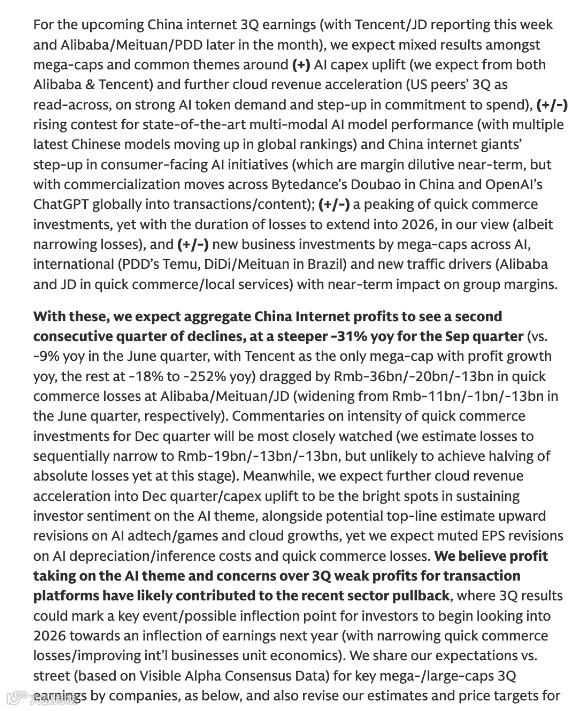 本文内容为高盛对2025年第三季度财报的前瞻性分析与展望,不构成实际财报解读。相关公司财报预计将于近期发布,敬请关注。2025年第三季度,中国互联网行业迎来关键转折点!高盛最新研报显示,行业整体利润同比下滑31%,但分化态势显著——腾讯凭借游戏与广告双引擎实现20%利润增长,而阿里巴巴、美团等因快速商业投入导致利润大幅承压。这场"冰与火"的较量背后,AI云业务的爆发式增长与国际化扩张的深度博弈,正在重塑行业格局。