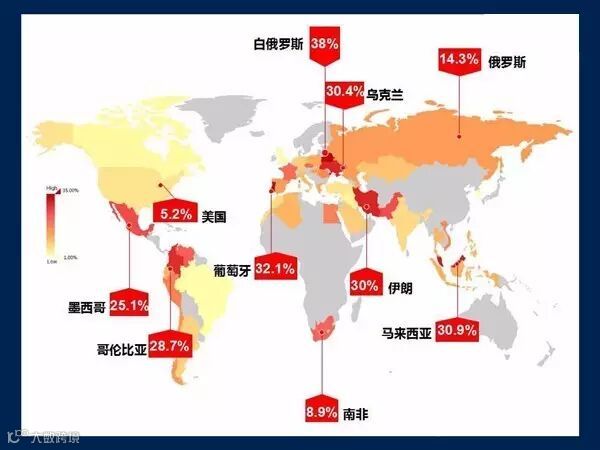 中国出海手机厂商全球分布图(颜色越深代表中国手机覆盖越广)