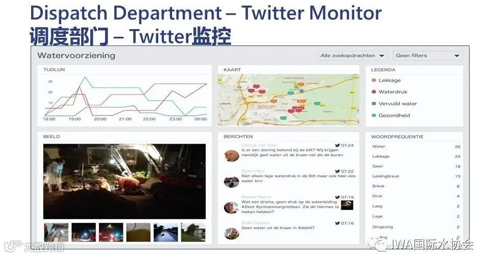 当然,供水企业应将客户服务作为处理问题的出发点方可获得最满意的解决方案。Rik Thijssen分享了Twitter监控功能,控制室屏幕上实时显示监测数据,如果出现爆管或超过一定水平的漏损,监控平台上会显示报警,并且可在实时社交媒体上与客户沟通对爆管事件的看法。