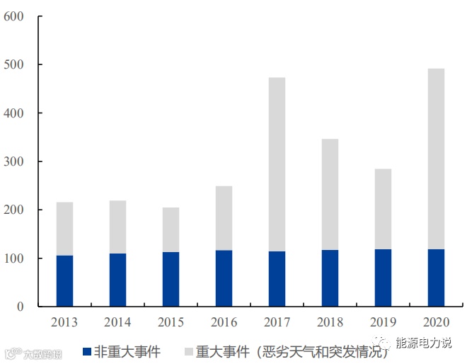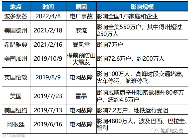 近年来海外各种大型停电事件突发。根据EIA统计,2020年美国平均每客户断电时长高达492小时,其中恶劣天气及突发情况等重大事件导致的停电时长为373小时。2022年中国台湾发生电厂事故,影响影响549万户,丧失1050万千瓦,约占全台1/3电力。