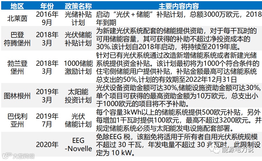 德国及各州政府均出台过补贴与税收减免政策降低户储的安装成本从而来支持户储发展,其中图林根州储能设备补贴30%,巴伐利亚州3kwh以上提供500欧元补贴,每增加1kwh多100欧元补贴。