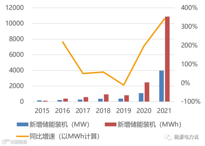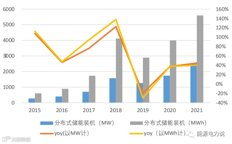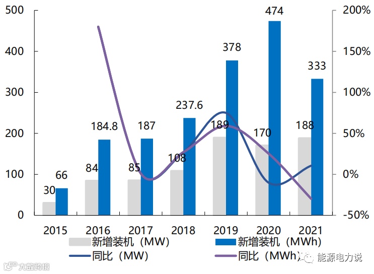中国储能装机近两年处于高速增长,2020年新增储能装机达1.37GW/2.48GWh,同比增长153%/189%,2021年新增储能装机达2.45GW/4.61GWh,同比增长79%/86%,其中最主要的贡献来自于我国的集中式储能装机,我国分布式储能仍处于发展初期,经济性不高,2021年分布式储能装机为188MW/333MWh,同比+11%/-30%,集中式储能占比超90%。