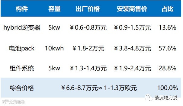 典型的系统一般是5KW(组件+逆变器)配套10kWh(储能电池)或者10kW+10kWh,其中电芯是储能系统的核心,成本占比约45-50%;储能变流器可以控制充放电,进行交直流的变换,成本占比约10-15%;组件系统即光伏系统用于太阳能发电,成本占比约20-25%;安装费用由2021年的1万上涨至2万左右,占比15-20%。