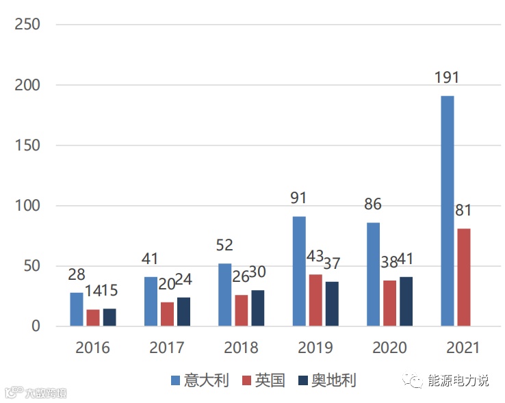 除德国外其余位于户储装机规模前列的意大利、英国、奥地利在电价与政策推动下,每年新增户储装机规模稳步增长。截止2021年底,英国户储装机规模为81MWh,同比增长113%,意大利在欧洲地区户储装机量仅次于德国,2021年意大利户储装机191MWh,同增122%。