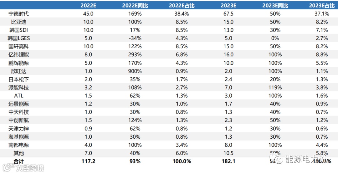 根据测算,预计2022-2023年全球储能电芯出货117.2/182.1GWh,同增93%/55%;其中,宁德时代作为最大电芯供应商占据榜首,我们预计宁德时代2022-2023年出货45.0/67.5GWh,同增169%/50%,占比38.4%/37.1%。
