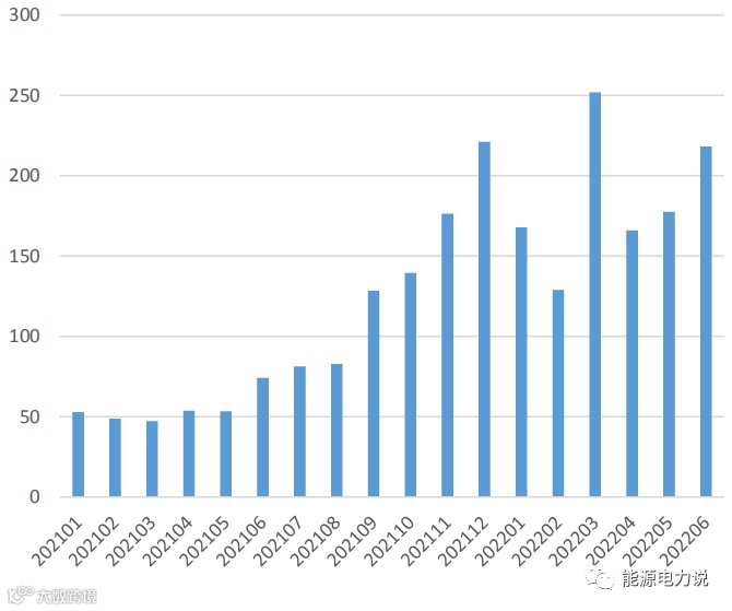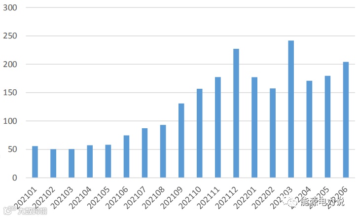 2021年德国新增户用储能1.48GWh,同增45%,占全球的34%;累计装机3.92GWh,同增60.6%,占全球的32%。2021年德国光储渗透率为3.6%,位居全球第一。能源危机下,电价上涨,刺激户储需求高增。德国平均批发电价从2021年1月的52.8欧元/MWh上涨至2022年6月的最高206欧元/MWh,增长313%。