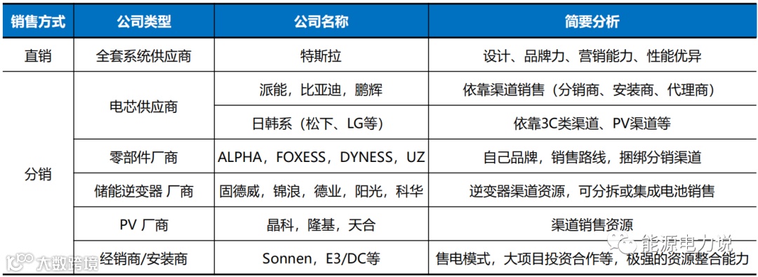 销售模式包括直销与分销,品牌与渠道构建优势。三类玩家在户用储能产业链中的销售模式分别如下: