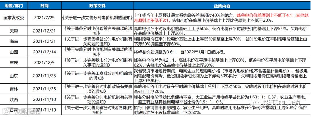 G2021年底,全国多个省市陆续出台相关政策调整峰谷价差推动用户侧储能发展。2021年7月29日国家发改委发布《关于进一步完善分时电价机制的通知》,此次分时电价机制设定峰谷电价价差为4:1或3:1以上,拉大峰谷电价,刺激用户侧储能发展。