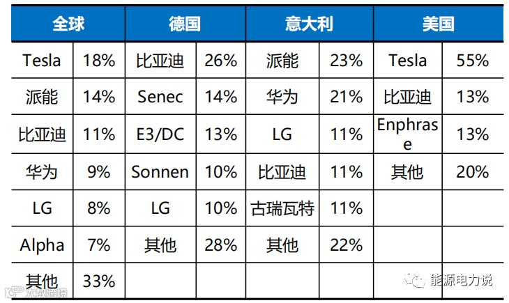 户用储能供应商呈现明显地域分布特征,特斯拉主供美国市场,派能深耕欧洲市场。