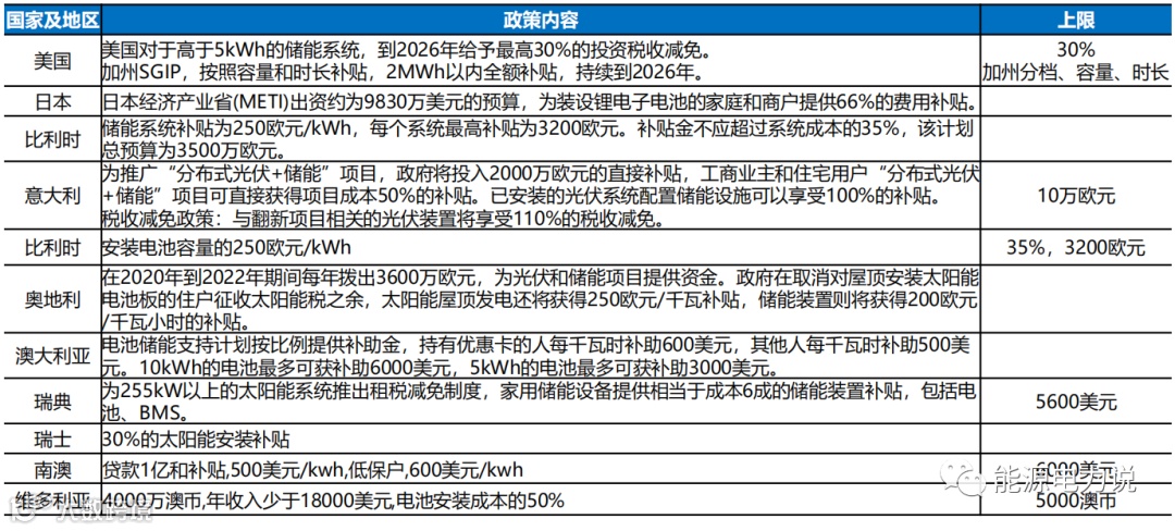 相关政策主要可以分为两类,一类是实行相关税收的减免,如意大利将家储设备税收减免提升到110%,美国对于高于5kWh的储能系统,到2026年给予最高30%的投资税收减免;另一类则是实施资金补贴,如日本为装设锂电子电池的家庭和商户提供66%的费用补贴,德国巴伐利亚州为每个容量3kWh以上的储能系统提供500欧元(550美元)补贴。