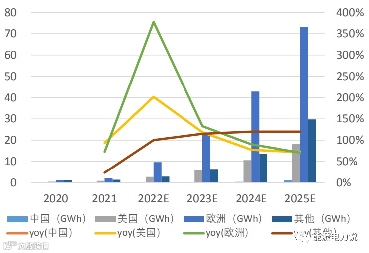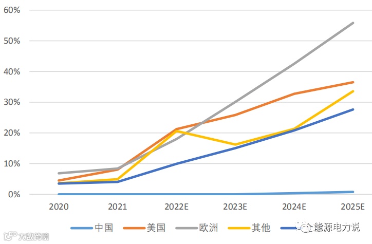 全球户储渗透率有望加速提升,我们预计到2025年户储渗透率有望达28%,其中美国和欧洲是最重要的两个增长点,我们预计美国户储渗透率有望从2021年8%提升至2025年36%,欧洲户储渗透率有望从2021年8%提升至2025年56%。
