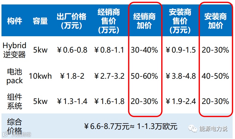 目前国内定价偏低,保证20%-30%毛利,一体机的毛利高于仅出售电池或者逆变器的毛利。海外定价模式下,人工工资及海外差旅费用提高成本,此外还需考虑5%左右的返修/售后费用等。海外销售价格经经销商及安装商分别加价30-50%。
