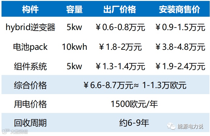假设系统由5kW逆变器及10kWh储能电池构成,系统售价为逆变器、电池、组件及安装费用三者之和共6.6万元≈1万欧元。假设仅考虑自用10kWh/天,不考虑上网,则每日节省电费4欧元,回报周期为6-9年。如考虑补贴因素,该投资周期可进一步缩短至2-3年。