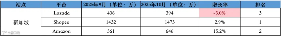 在新加坡市场,Amazon访问量大幅上涨15.2% 至646万,增速迅猛,显示出国际巨头在该市场的积极扩张。而东南亚本土平台Lazada则逆势下跌3%。