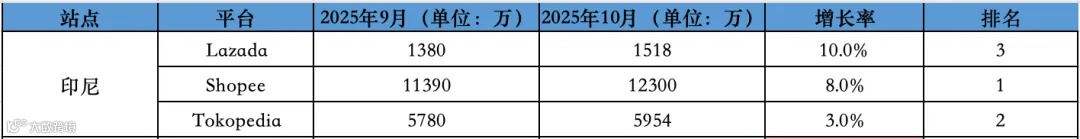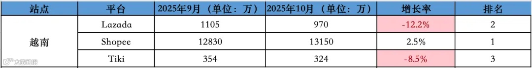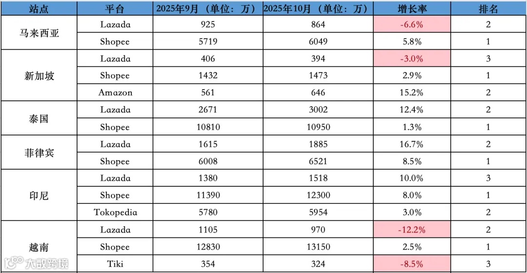 近日,数据分析网站 Similarweb 发布了 2025 年 10 月份东南亚各电商平台访问量(桌面+移动端)及相关数据。