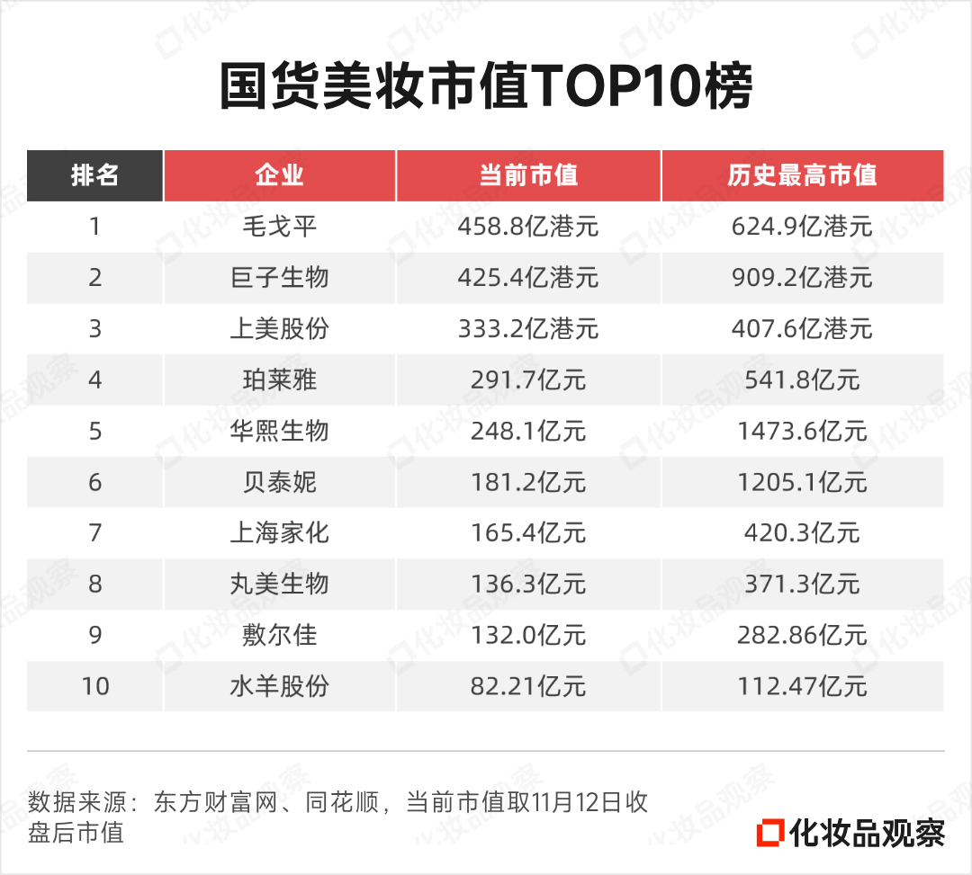 截至11月12日收盘,国货美妆市值前三强均落于港股阵营,依次为毛戈平、巨子生物与上美股份,市值分别为458.8亿港元、425.4亿港元、333.2亿港元。