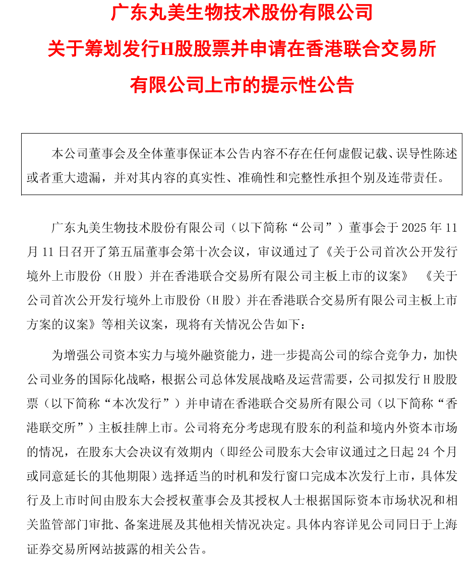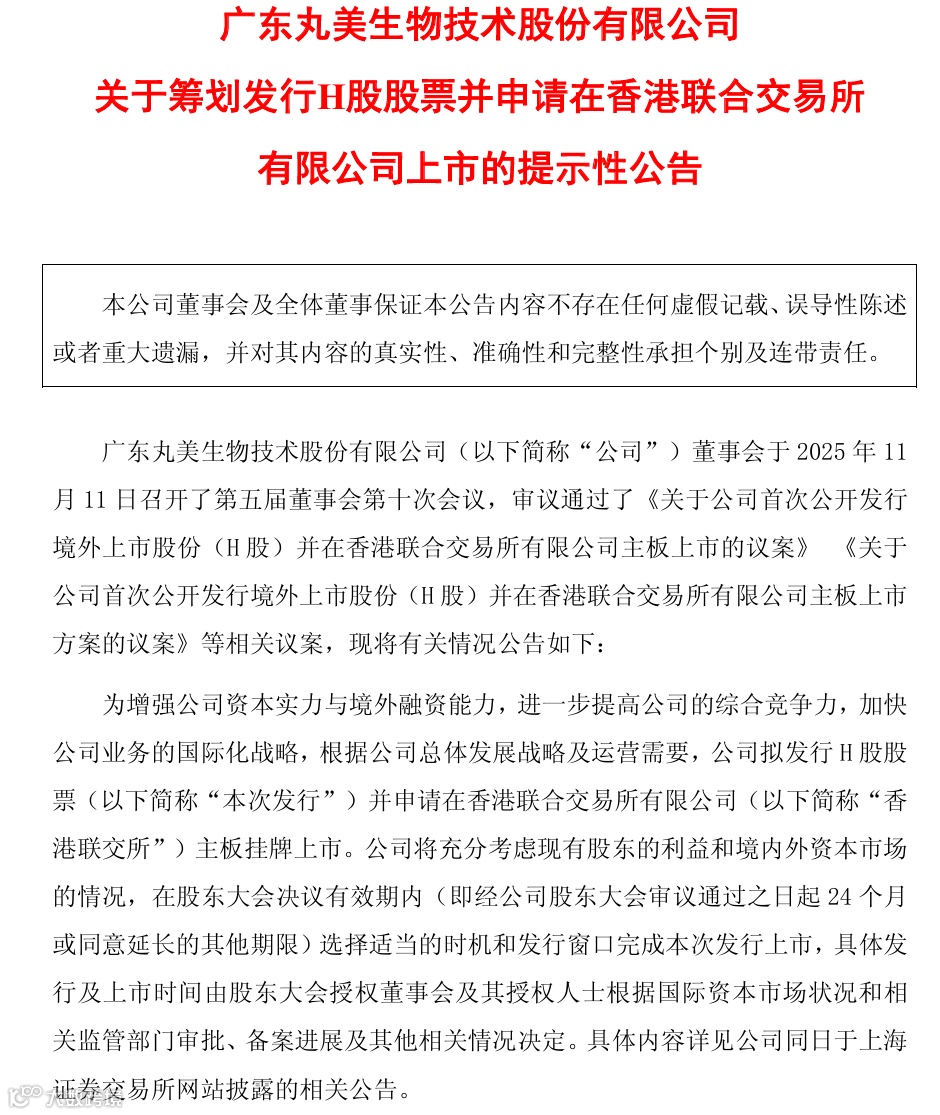 昨日(11月12日),丸美生物发布公告称,为增强公司资本实力与境外融资能力,进一步提高公司的综合竞争力,加快公司业务的国际化战略,公司拟发行H股股票并申请在香港联合交易所有限公司(以下简称“港交所”)主板挂牌上市。