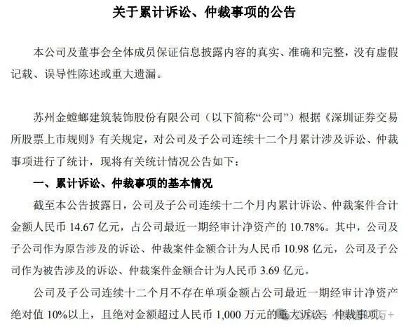 11月11日,金螳螂(002081)发布近一年累计涉及诉讼、仲裁案件合计金额14.67 亿元,占公司最近一期经审计净资产的 10.78%。