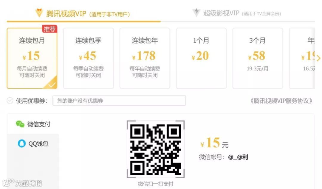 在PC会员产品上,开通腾讯视频会员价格连续包月/包季/包年价格分别为:15元、45元和178元。单月/单季/单年分别为:20元、58元和198元。此外还设置了适用TV全屏通的“超级影视VIP”,连续包月/包季/包年价格分别为:30元、88元和348元。单月/单季/单年分别为:50元、148元和488元。