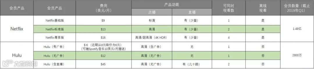 在会员产品方面,Hulu在2019年初宣布,从2月26日开始,它将基于广告支持的订阅计划的价格由每月7.99美元降至每月5.99美元。而每月11.99美元的“无商业广告”计划和每月12.99美元Hulu/Spotify组合订阅将保持现有价格。2019年3月消息,Hulu和Spotify合作将每月的费用从12.99美元降到9.99美元,优惠政策持续到6月10号。Hulu还表示,未来消费者可以以不含广告的方式为单个节目付费,而不必订阅不含广告的整体服务。