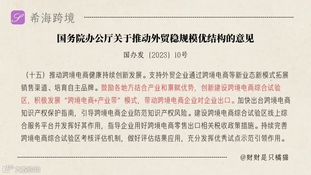 《关于推动外贸稳规模优结构的意见》首次提出“”跨境电商+产业带“”模式